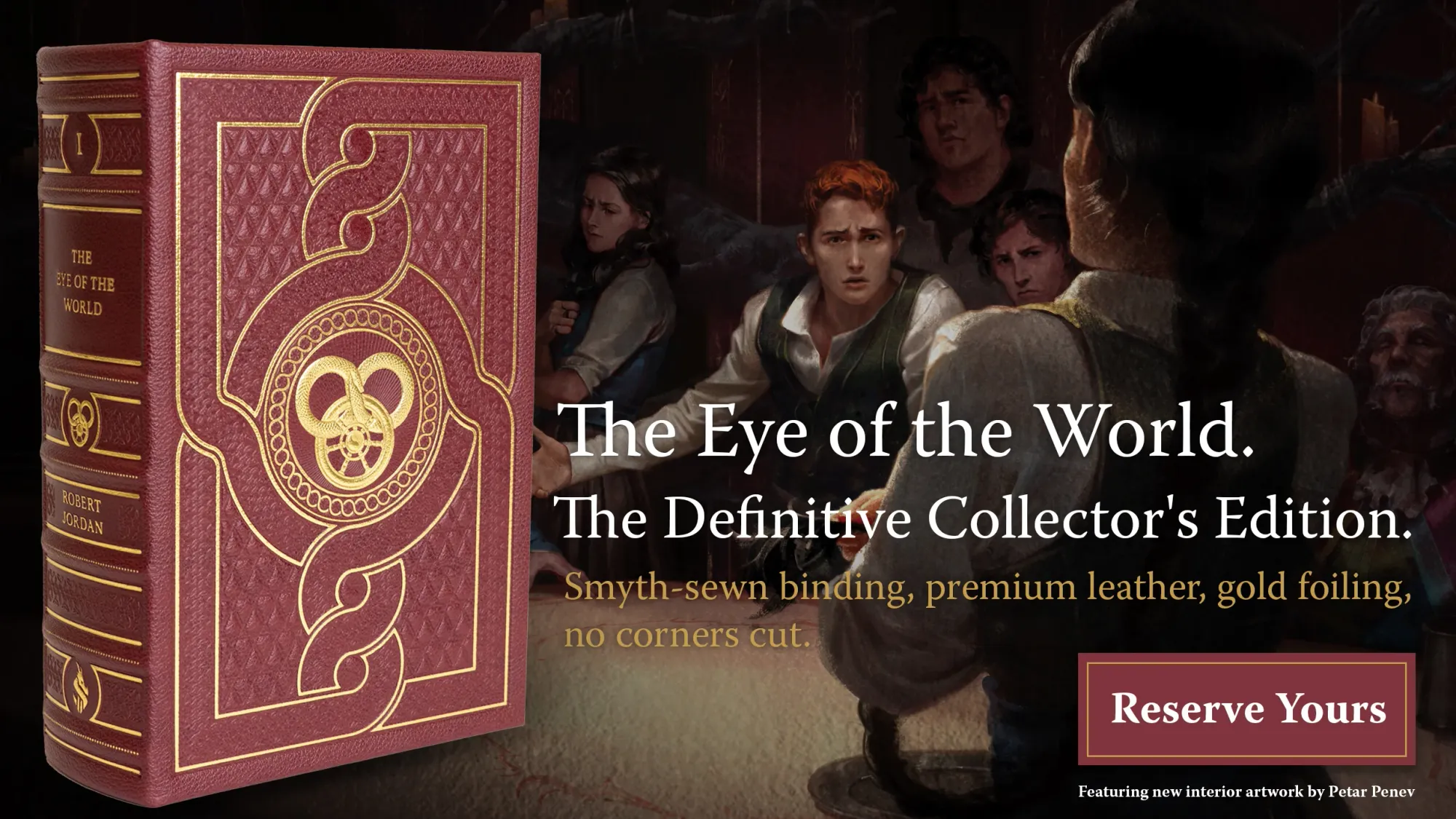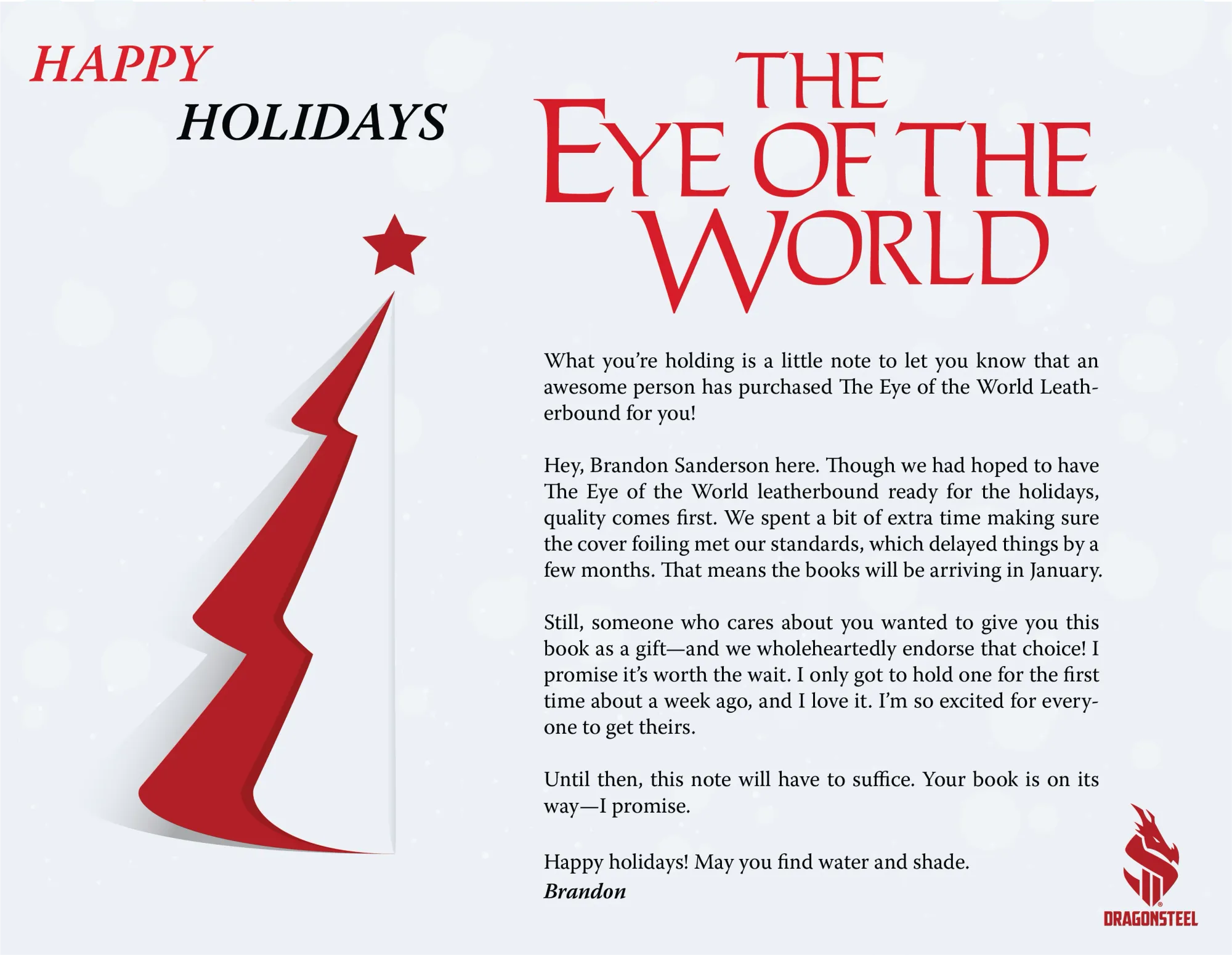 哈囉,這裡是布蘭登 · 山德森!儘管我們希望能在佳節期間帶給你《時光之輪 1:世界之眼》皮革版,但品質是最重要的事。我們多花了一些時間確保封面燙金的成果符合我們的標準,這導致整個時程延誤了幾個月的時間,也就表示書籍必須在一月才能抵達你的手上。